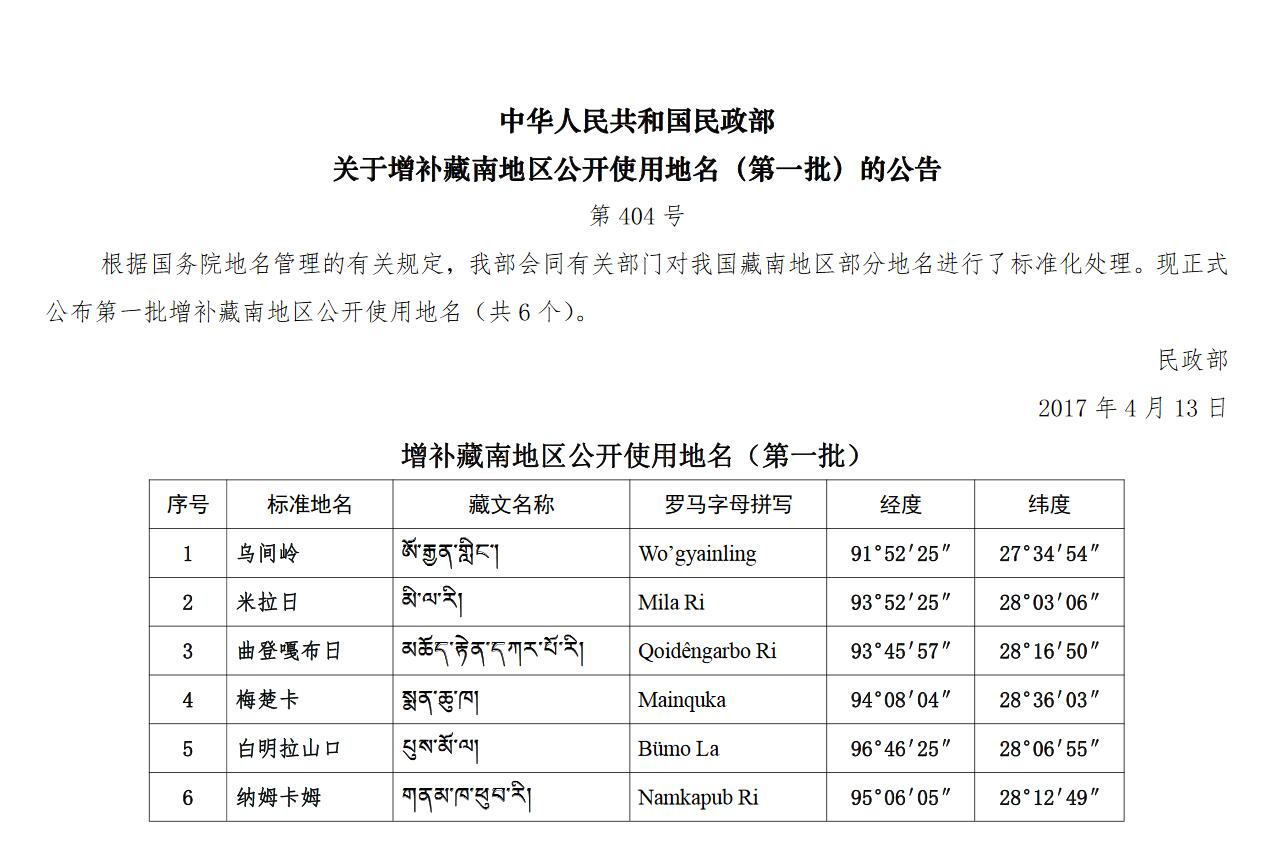據民政部網站4月14日消息,日前,民政部根據國務院地名管理的有關規定,民政部會同有關部門對我國藏南地區部分地名進行了標準化處理。此次標準化處理政事增補第一批藏南地區公開使用地名(共6個)。