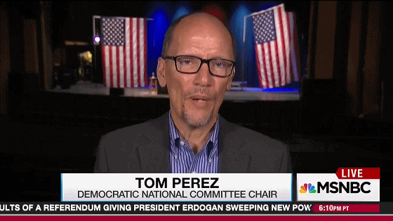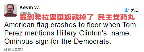 事情是這樣的,本週一(4月17日)民主黨在緬因州的波特蘭市舉行“眾志成城來反抗”(Come together fight back)集會,會後新任民主黨全國委員會(DNC)主席湯姆·佩雷斯(Tom Perez)接受MSNBC的採訪,主持人問到關於希拉里和桑德斯的問題,就在佩雷斯提到希拉里的名字時,身後的大型國旗突然控制不住它寄幾……掉到了地上。