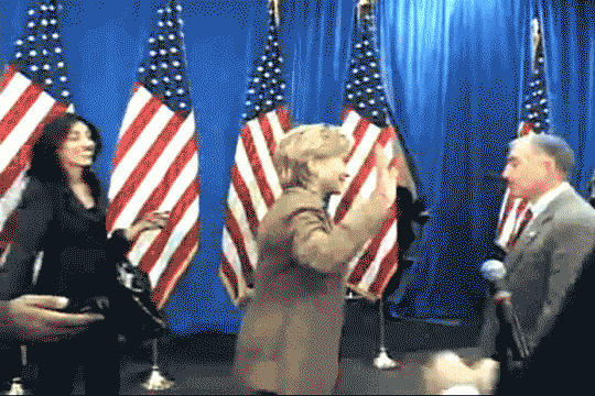2007年希拉里第一次參選總統,當年12月她參加老兵紀念日的活動後接受記者採訪,回答完問題要離場時,面前的一排國旗突然接連倒下,她和工作人員趕忙過去扶,場面一度十分混亂。