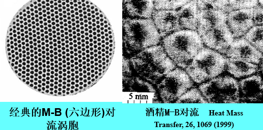 Marangoni-Bénard對流是流體物理經典問題之一,已有長達一百多年的豐富研究歷史。非牛頓流體層在一定的温度梯度驅動下會發生自然對流,如果流體層上表面是自由表面,且由表面張力引發的對流流動稱為Marangoni-Bénard對流或熱毛細對流。對於不考慮表面存在蒸發相變液層呈現出規則的六角形Marangoni-Bénard對流渦胞來説(見下面左圖),可以用經典理論可以很好的解釋。