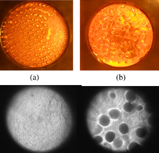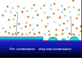 水蒸汽凝結在(金屬)固壁上的液體形貌變化:(a)滴狀冷凝; (b) 滴狀和液膜冷凝;光學觀測圖像(下圖)