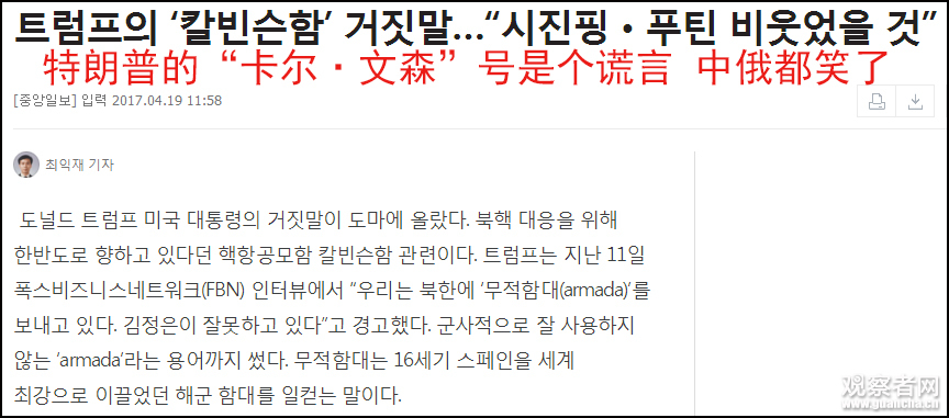 對於近日有關“卡爾·文森”號各種自相矛盾的報告,韓國媒體也是緊咬不放。