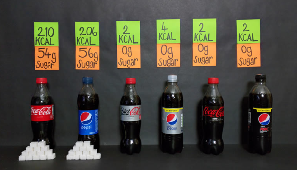 可口可樂和百事可樂不同產品的含糖量(橙色)和熱量(綠色)