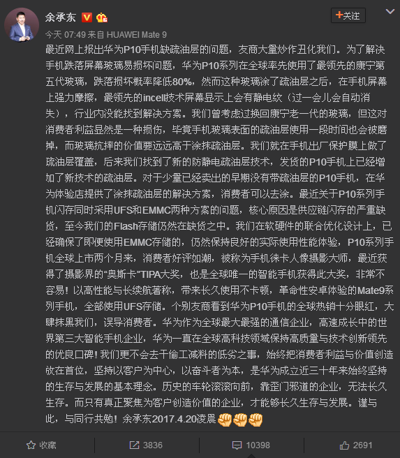 餘承東回應中還提到:“個別友商看到華為P10手機的全球熱銷十分眼紅,大肆抹黑我們,誤導消費者。華為不會去幹偷工減料的低劣之事。”