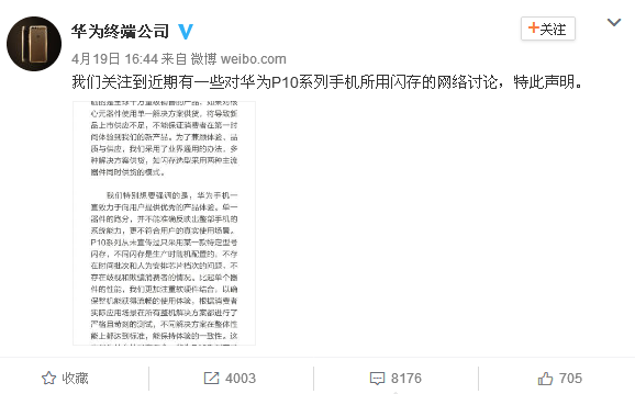 4月20日上午,華為終端CEO餘承東對此事做了回應。“最近關於P10系列手機閃存同時採用UFS和EMMC兩種方案的問題,核心原因是供應鏈閃存的嚴重缺貨。”他表示,已經確保了即便使用EMMC存儲的P10手機,仍然保持良好的實際使用性能體驗。