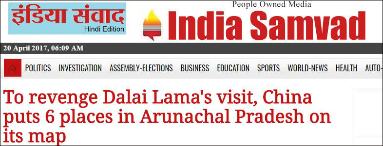 印媒報道截圖,稱中國增補地名是對達賴竄訪的報復