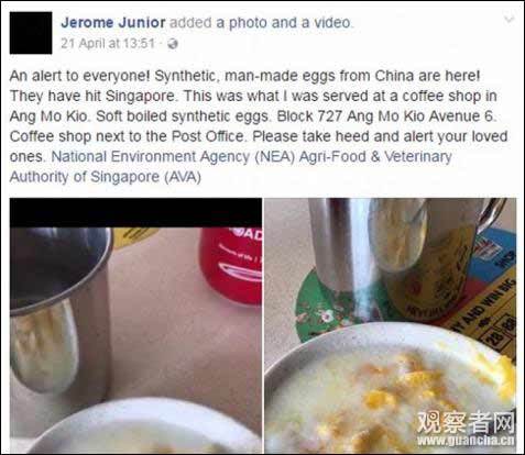 該國44歲的IT人士傑羅姆(Jerome Junior)懷疑自己在一家咖啡店吃到假雞蛋。他將自己吃到的雞蛋拍攝短視頻並配文字稱,“每個人都注意了,中國製造的假雞蛋來了新加坡!我在宏茂橋的咖啡店吃到假雞蛋,一定要留心,並提醒你關心的人!”