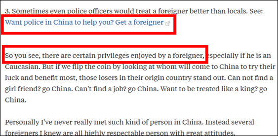 在“美版知乎”上一個涉及外國人在中國生活的話題裏,也有答主講到外國人在中國警察眼裏會有“特權”的現象