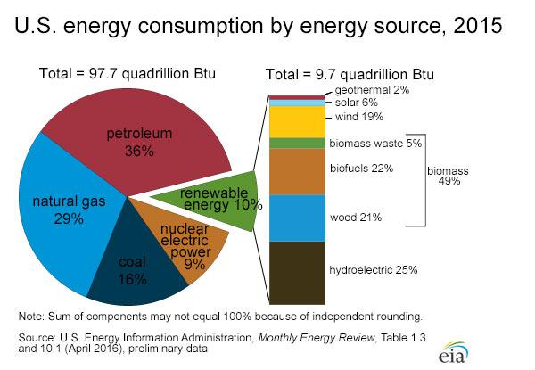 美國2015年的能源消費結構。可再生能源產業仍然顯得稚嫩。