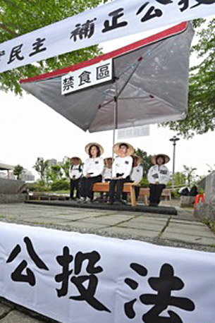 但在“場外”,4月26日,前民進黨主席,老台獨林義雄發起一場為期16日的接力禁食活動,要求“立法院”在5月20日前,通過公投法修正案,否則,要發動更強烈的抗議運動。