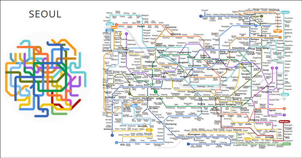 要在這樣嚴苛的格式下創作出縱橫交錯的軌道交通圖,絕非易事。尤其是那些地鐵線路本就複雜的大都市,比如首爾、東京、紐約、巴黎、上海以及北京等城市,對於創作而言都是不小的挑戰,但同時也是最有樂趣的部分。