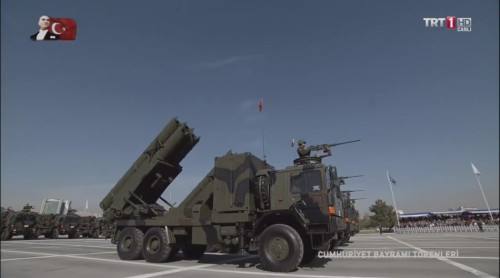 土耳其閲兵式上展示的國產T-300型四聯裝遠程火箭炮系統,是中國WS-1B型火箭炮的國產化版本,也是“風暴”導彈的始祖