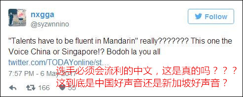 參加好聲音必須要普通話流利,這引發了兩地不少民眾,尤其是新加坡民眾不滿。