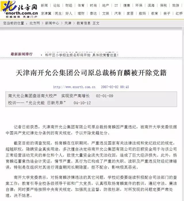 據南開大學新聞網2007年2月報道: 天津南開允公集團有限公司原總裁楊育麟因嚴重違紀,被南開大學黨委依據中國共產黨紀律處分條例的有關規定,予以開除黨籍處分。