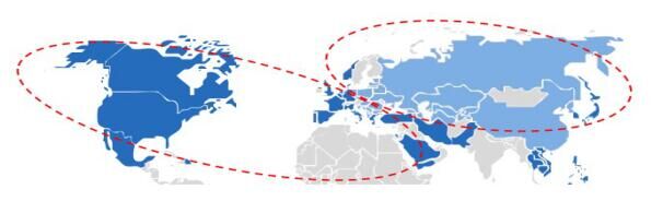 [11]特此感謝中央財經大學金玥幫助製作圖1和圖2。因冷戰時期美蘇在南半球的勢力較為分散,圖1主要顯示了北半球的情況。圖2暫時忽略了西歐,因其雖是美國的政治盟友,特朗普政府對跨大西洋貿易與投資夥伴協議(The Transatlantic Trade and Investment Partnership, TTIP)的反對態度使其與第二個經濟帶融合受阻。