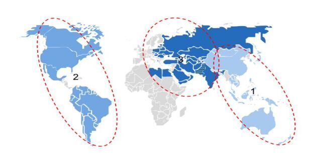 如圖2所示,這三個經度帶狀圖,一個是建立在數個區域組織,例如東南亞國家聯盟(Association of Southeast Asian Nations, ASEAN)基礎上的亞太地區共同體(如上圖所示經濟帶1),另一個是在北美貿易協定(North American Free Trade Agreement, NAFTA)和南方共同市場(MERCOSUR)等協議基礎上的美洲貿易共和體,包括美國、加拿大、墨西哥和大部分南美國家。