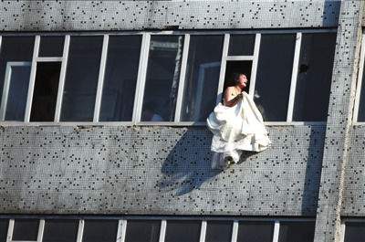 瀋陽市蘇家屯一準新娘站在15樓陽台上要跳樓,一條腿伸到了窗外,半個身子探了出來……經民警2小時勸説營救,新娘最終放棄輕生念頭自行退回屋內。