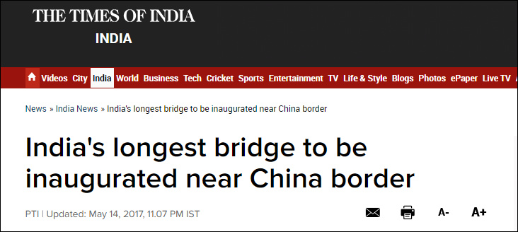 “靠近中印邊境的印度最長大橋落成”,截圖來自“印度時報”