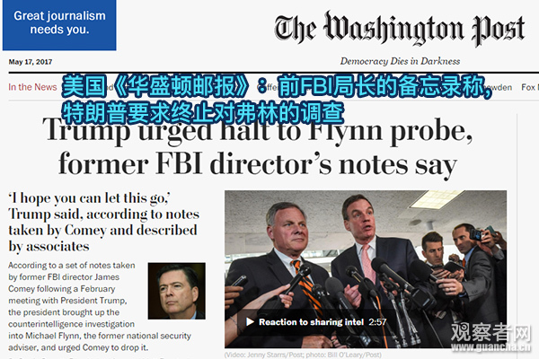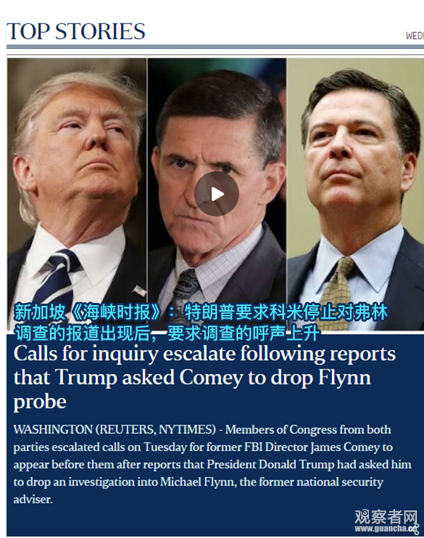 《紐約時報》雖然沒有確切證據,但在頭條上言之鑿鑿地稱,特朗普曾要求前聯邦調查局局長科米(James Comey)停止對前國安顧問弗林(Michael Flynn)的“通俄”調查——此舉涉嫌干預司法調查,違憲。