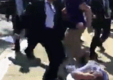 衝突現場一名穿西裝男子正在猛踢一名抗議者頭部
