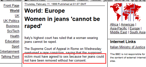 1999年2月,意大利最高法院在裁決一起強姦案時,認定一名18歲的女學生沒有被強姦。原因在於事發時她穿着牛仔褲,而“穿牛仔褲的女孩是不可能被強姦的,一旦你脱下牛仔褲,説明你主觀上已經同意與他發生性行為。”此案在當時受到公眾的廣泛爭議。