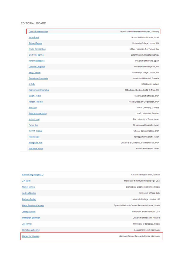 比如,德國海德堡癌症研究中心原主席、2008年諾貝爾生理學或醫學獎獲得者Harald zur Hausen説他都不知道自己在《腫瘤生物學》公開的編委名單中。在他的記憶中,他沒有審過一篇來自《腫瘤生物學》的論文;