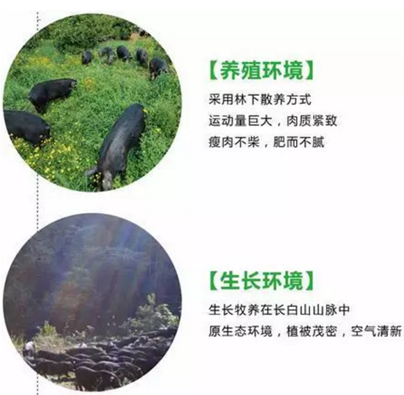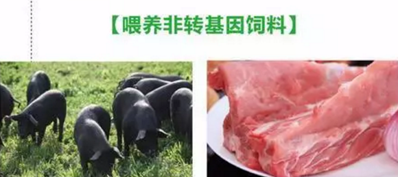 再看這個黑豬,強調的是黑豬品種、散養,吃的是非轉基因飼料。