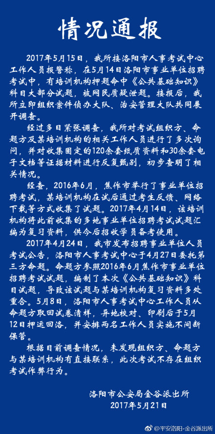 據澎湃新聞21日報道,河南省洛陽市公安局金谷派出所5月21日對“洛陽事業單位招聘考試考題疑遭泄題”一事發布通報,據新華社5月15日報道,洛陽市直和縣區事業單位招考筆試結束後,有網友反映某培訓機構考前押題命中了75道《公共基礎知識》題中的70道,不少題目的題號、順序、答案選項都一模一樣,懷疑考試被泄題。金谷派出所通報稱,根據目前調查情況,此次考試不存在組織方考試作弊行為。