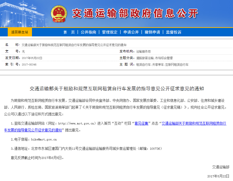 5月22日,交通運輸部網站公佈了交通部會同多部委聯合起草的《關於鼓勵和規範互聯網租賃自行車發展的指導意見(徵求意見稿)》(下稱“意見稿”),並現向社會公開徵求意見,意見徵求時間為兩週。