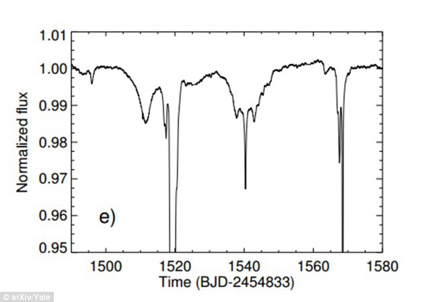 開普勒望遠鏡記錄了這顆恆星怪異的亮度變化:它的光變曲線上有凹坑,但並非週期性出現。有些凹坑很深,有一個深達15%,還有一個甚至深達22%!這種程度意味着不可能是行星經過恆星表面造成的。而食雙星、恆星黑子、自轉等已知因素引起的光強下降也只有2%左右。科學家們還排除了其他可能的解釋,如巨大的塵雲等。