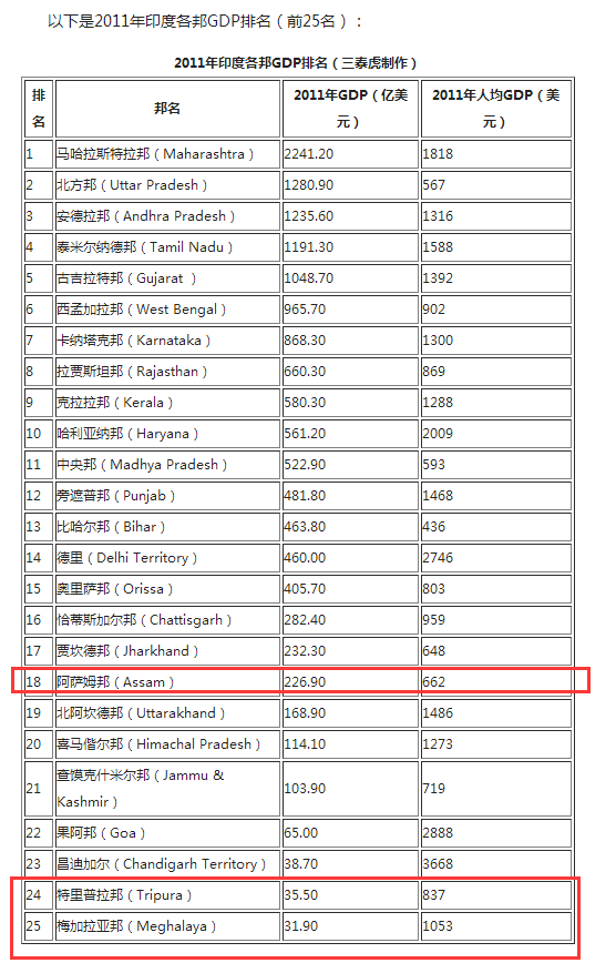 注:那加蘭邦、曼尼普邦、米佐拉姆邦因為GDP太低,未計入排名。
