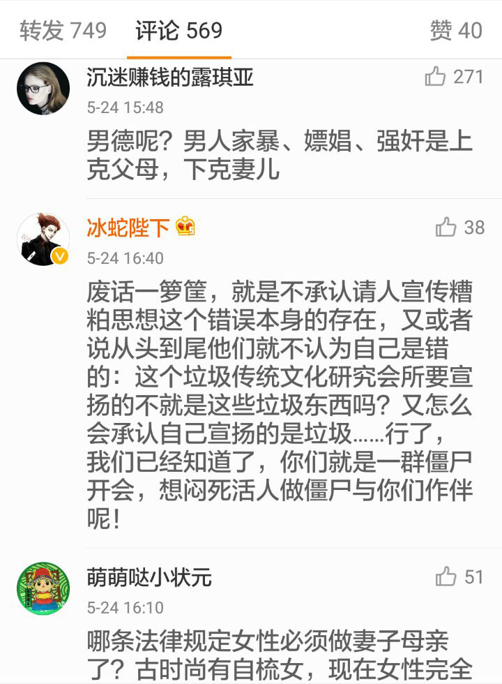5月21日,《中國婦女報》為此發表了一篇文章,名為《某些人宣揚的所謂“女德”,已經觸碰性別平等的文明底線》,作者為高富強。文章中對丁璇的“女德”言論進行批判,稱這樣的言論已經觸碰到社會文明底線,既不符合男女平等的基本要義,又與一般的生活常識相悖。並表示丁璇口中所謂的“女德”無非就是束縛女性、奴役女性、壓迫女性的歪理邪説。