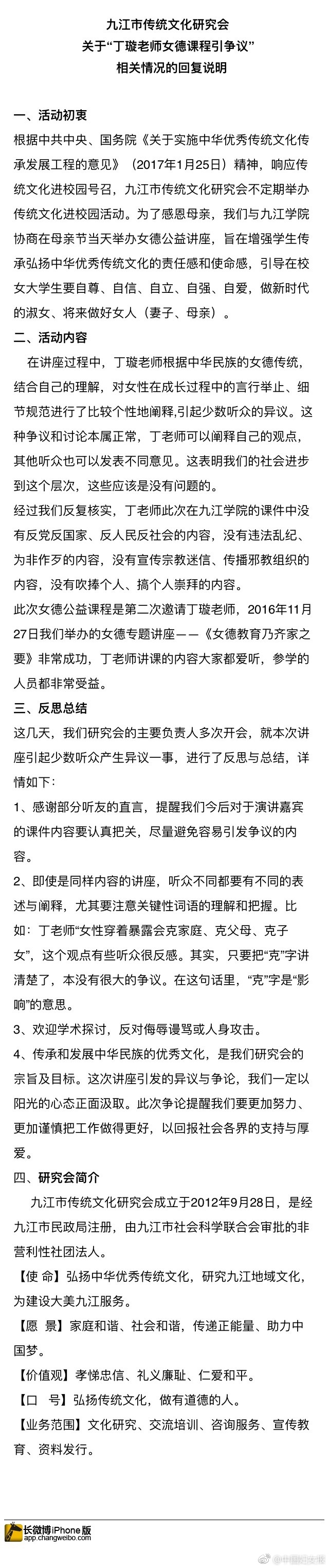 針對有關丁璇在江西九江學院給女大學生做女德講座的內容引起爭議事件,講座的主辦方,九江市傳統文化研究會今天通過《中國婦女報》發出一份回覆説明。