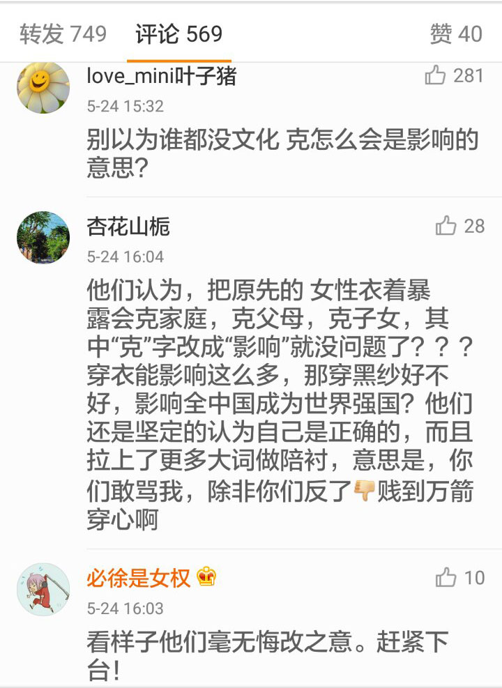 對於丁璇在講座中宣揚的“女性穿着暴露會克家庭、克父母、可子女”的觀點引發觀眾的反感,該研究會辯稱“其實只要把‘克’字講清楚了,本沒有很大的爭議。在這句話裏,‘克’字是‘影響’的意思。”