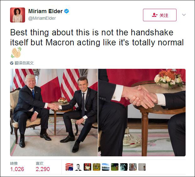 Buzzfeed編輯都來隔空點贊:這次握手不是最讚的,讚的是馬克龍若無其事的表情。