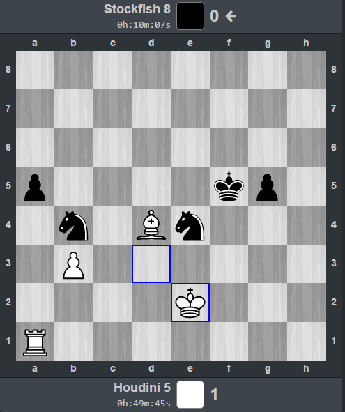 在今年最後的超級總決賽中,衝破重圍的Houdini和擂主Stockfish展開了驚天動地的百輪大戰,最終Houdini稍遜一籌,以45.5比54.5負於對手,這也再次確立了Stockfish的AI總盟主地位。