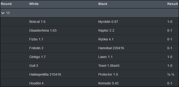 在著名的國際象棋對戰直播網chessbomb上,已經成系統地、有規模地舉辦了多年的AI比拼大賽,令廣大棋迷大飽眼福。如圖: