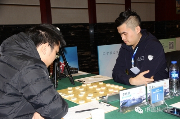 當時,“屌絲”這個比較低俗的詞才剛剛在網上傳開尚未大肆流行,所以文內一句“棋手穿的都跟個窮屌絲似的”讓筆者印象很是深刻。稍顯刻薄的行文卻的確反映出了中象包裝不力的難堪事實。讀者可以瀏覽下面兩張圖,分別是李炳賢對王天一,和王天一對鄭惟桐,都是國內中象最高水平的個人賽。第一張雙方在沒有空調的賽場內只能穿着厚厚的衣服,第二張圍觀的吃瓜羣眾在旁邊吸溜吸溜地喝水。