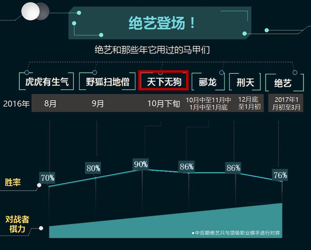 絕藝人工智能自2016年11月起使用絕藝賬號在騰訊野狐圍棋網絡對弈平台上公測。截至2017年5月12日,絕藝賬號的總戰績為590戰454勝136負,勝率約為77%。戰勝過的對手包括柯潔、樸廷桓、井山裕太、陳耀燁、唐韋星、古力、常昊、時越等等世界冠軍棋手。