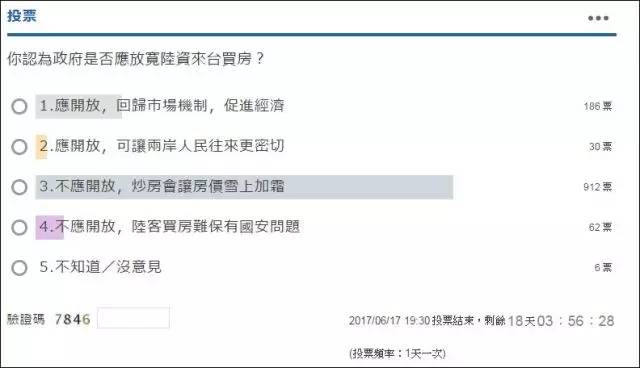 對於台當局“內政部”放行44名大陸買家過户,有台灣網民擔憂,陸資買房政策鬆綁,台灣的房價地價就要漲上天了。根據台灣聯合新聞網的一項投票調查,有近八成的台灣網民認為,不應放寬陸資赴台買房。