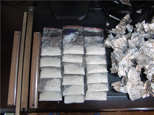 多個拉桿箱堆放在房間角落,拉桿被拆下,鋸斷,準備填充冰毒。警方當場繳獲毒品冰毒1千克。