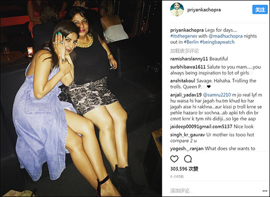 面對批評聲浪,喬普拉很快在Ins上曬出和媽媽穿着短裙的照片委婉回應,8小時內就有30萬人點贊。
