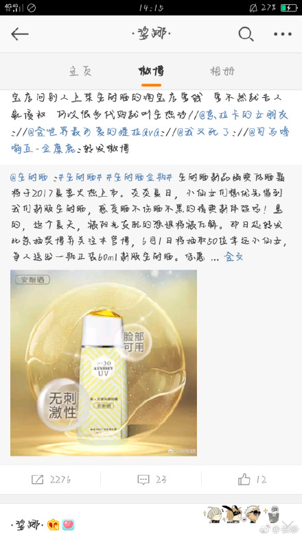 原來是一條抽獎博,轉發抽送“安耐曬新品幽爽防曬霜”,還打了#安耐曬#和#安耐曬金瓶#的tag。