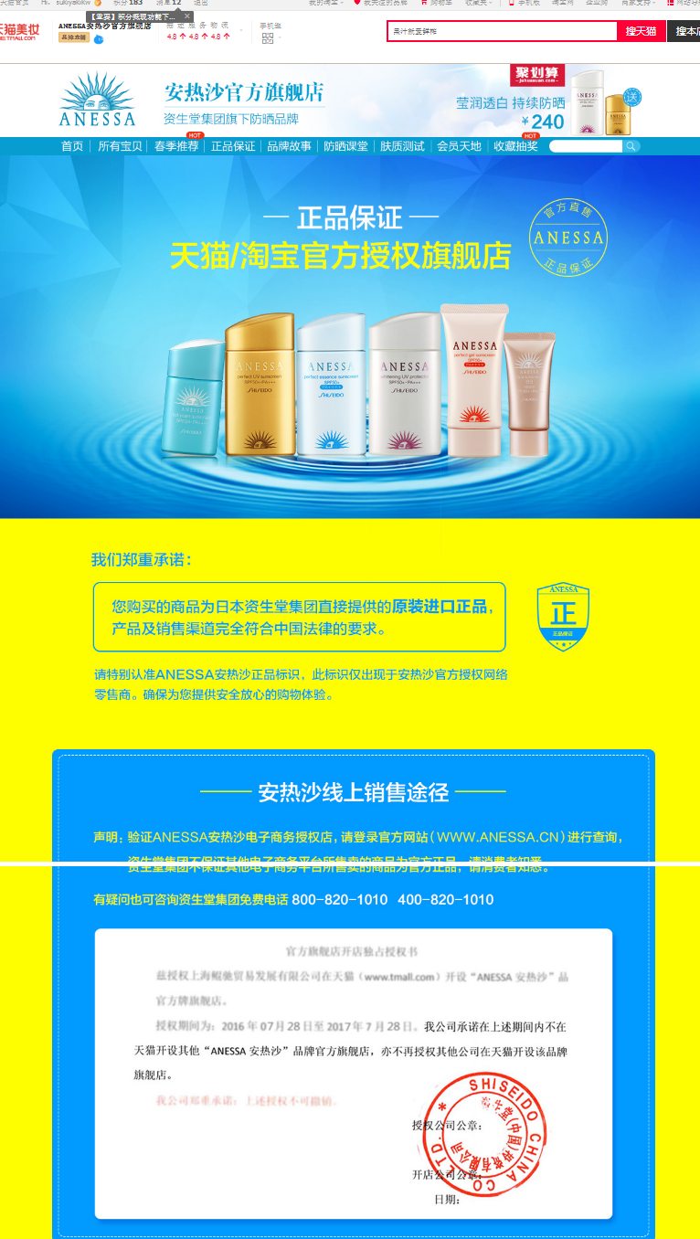 再按店鋪搜索“安耐曬”,首先排名第二位的是一家名叫“ANNESSA安熱沙官方旗艦店”的店鋪。