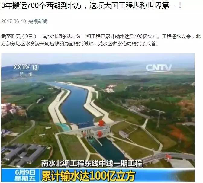根據央視的報道,**截至6月9日,南水北調東線中線一期工程已累計輸水達到100億立方米,這些水量,相當於從南方向北方搬運了700個西湖。**根據北京市統計局發佈的數據,2016年北京市全年總用水量38.8億立方米,這意味着南水北調工程的輸水量已經接近北京市全年總用水量的3倍。