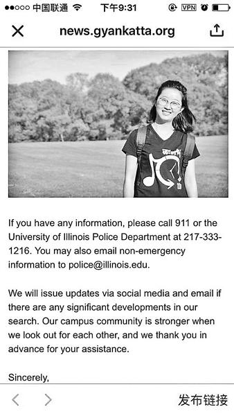 北京青年報記者瞭解到,章瑩穎本科畢業於中山大學,碩士就讀於北京大學,目前在中科院擔任助理研究員,是UIUC自然資源與環境科學系的訪問學生。失蹤消息發出後,上述幾所學校均通過校方平台轉載了尋人啓事。