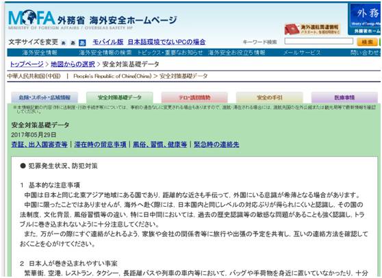 日本外務省官方主頁上有關提醒日本國民謹防在中國被懷疑“間諜行為”的信息
