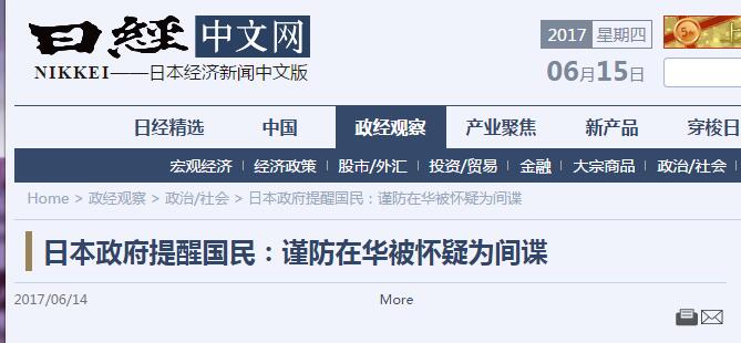 據環球時報6月15日援引日媒報道,現在至少有12名日籍男女因涉嫌間諜行為被中方拘留。日本外務省最近更新“海外安全”主頁中有關中國方面的信息,向在華工作的日本人及赴中國的日本遊客發出提醒,要求謹防被懷疑從事間諜行為。