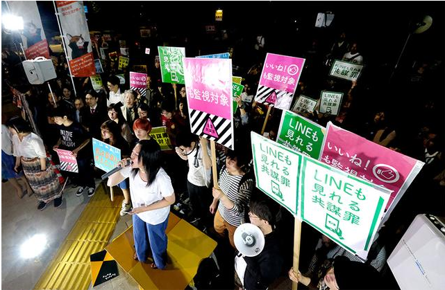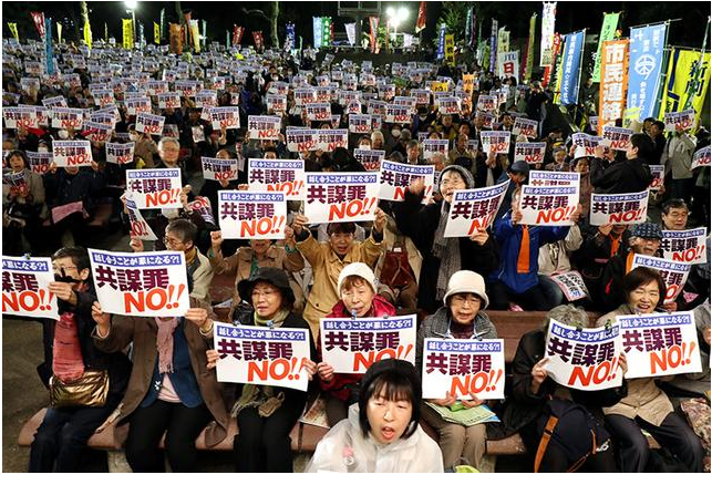 日本民進黨和日本共產黨等在野黨抗議,“將引發監控社會和搜查權濫用的擔憂置之不理”,要求廢除法案。但最終執政黨自民黨通過省略參議院法務委員會表決的特殊程序而強行通過。
