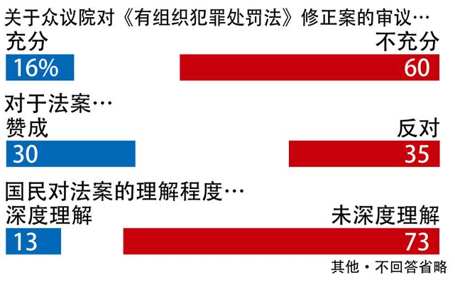 日本朝日新聞於5月24、25日以電話形式實施了全國緊急民意調查。期中,有60%的受訪者認為眾議院審議“不充分”,與認為審議“充分”的16%拉開了差距。關於是否贊成法案,30%的受訪者表示“贊成”,35%的受訪者表示“反對”,選擇“其他·不回答”的比例為35%。關於對此法案的理解程度,73%的受訪者表示“並未深度理解”,表示“深度理解”的僅佔13%。